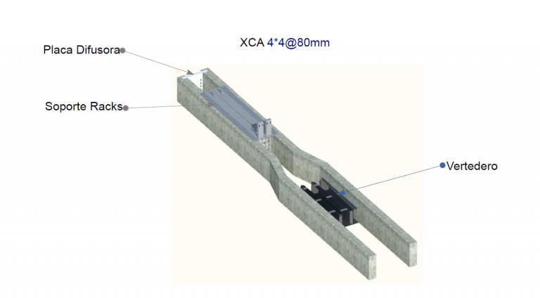 3. Finalmente, el caudal de agua será descargado a través de un vertedero, cuyo diseño permitirá mantener en todo momento las lámparas UV sumergidas y mantener el nivel de agua dentro de rangos controlados, frente a fluctuaciones del caudal de agua.