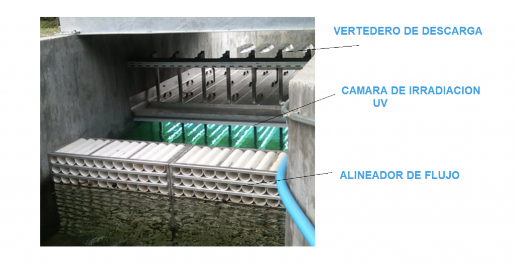 El Sistema completo consta de: Canal abierto construido en concreto, alineador de flujo, Cámara de irradiación UV y vertedero de descarga.